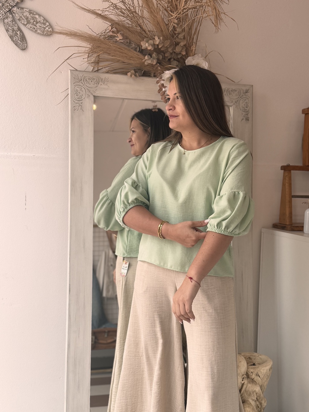 Blusa Sophia es una prenda que redefine el concepto de estilo casual. Confeccionada en un delicado material de lino, esta blusa de manga tres cuartos presenta un efecto globo que realza la silueta con un toque moderno y chic. Además, su elástico en los puños asegura un ajuste cómodo y favorecedor.