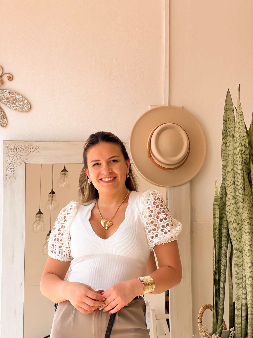Remera lycra morley, escote en v , combinado con mangas de encaje. Talle unico, abarca hasta un talle 3.