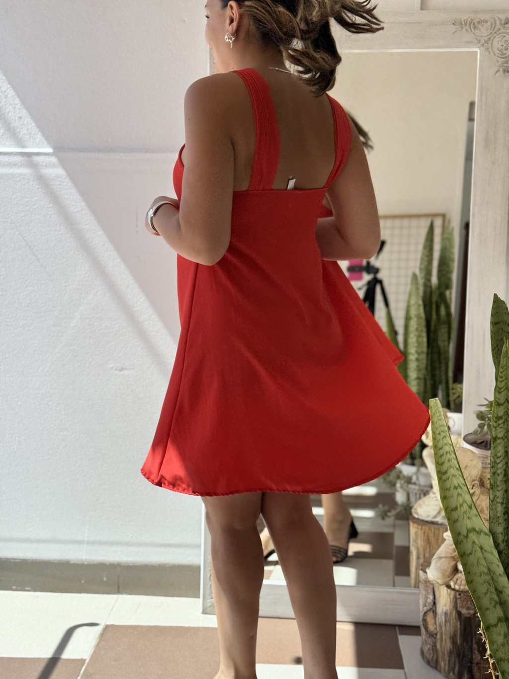 Vestido de gasa crepe con tira que regula el largo de la caida.